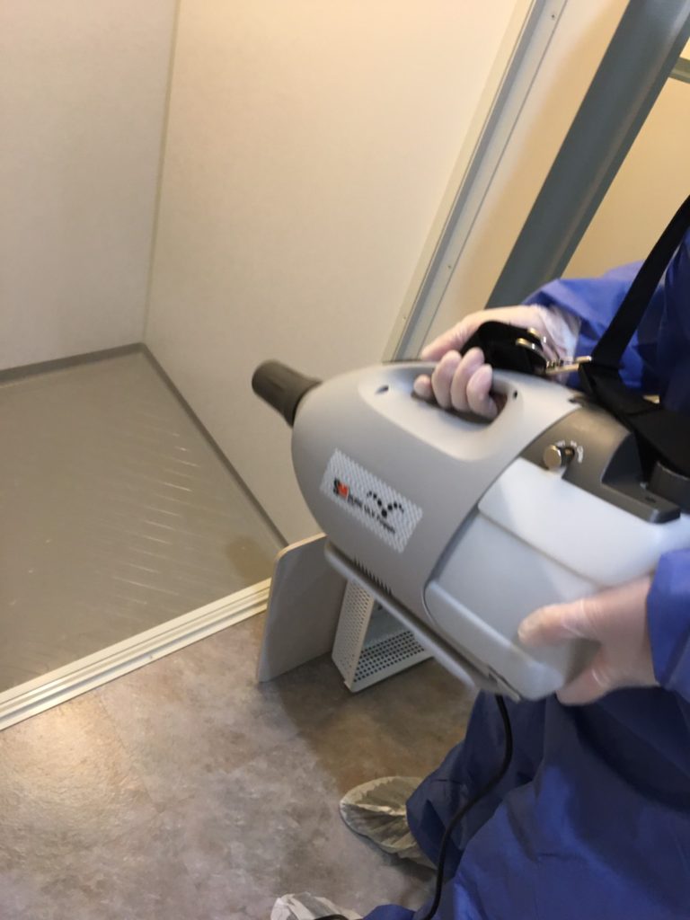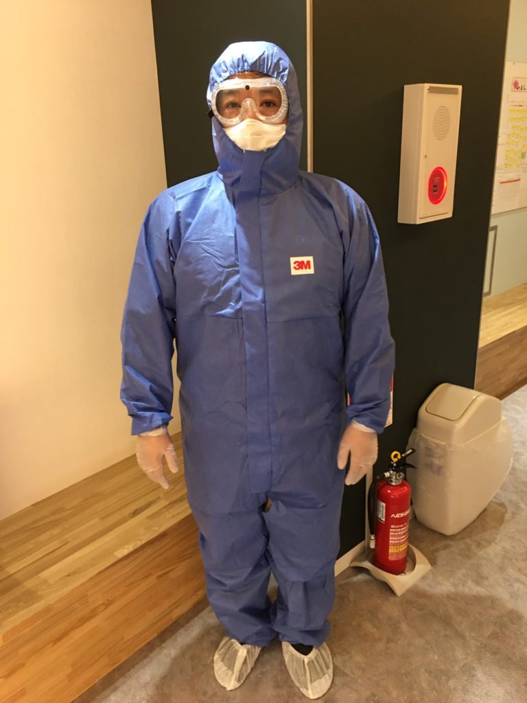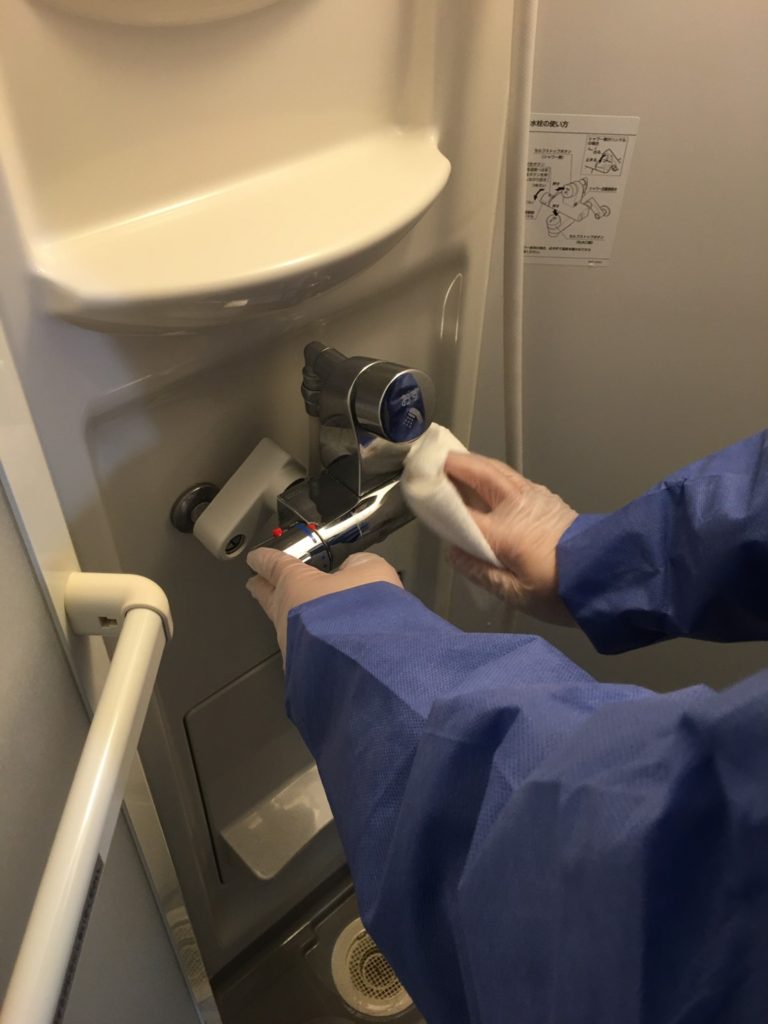 写真にもあるように作業者は慎重に作業に取り掛かります。防護服はもちろんの事ですが、さらにワンポイントの内容を取り入れるのがカバーオール!人がよく触れる箇所(例えば、ドアノブやスイッチなど)を「コンタクトポイント」と呼びます。カバーオールでは除菌剤の散布に加えて、コンタクトポイントの清拭も含まれています!