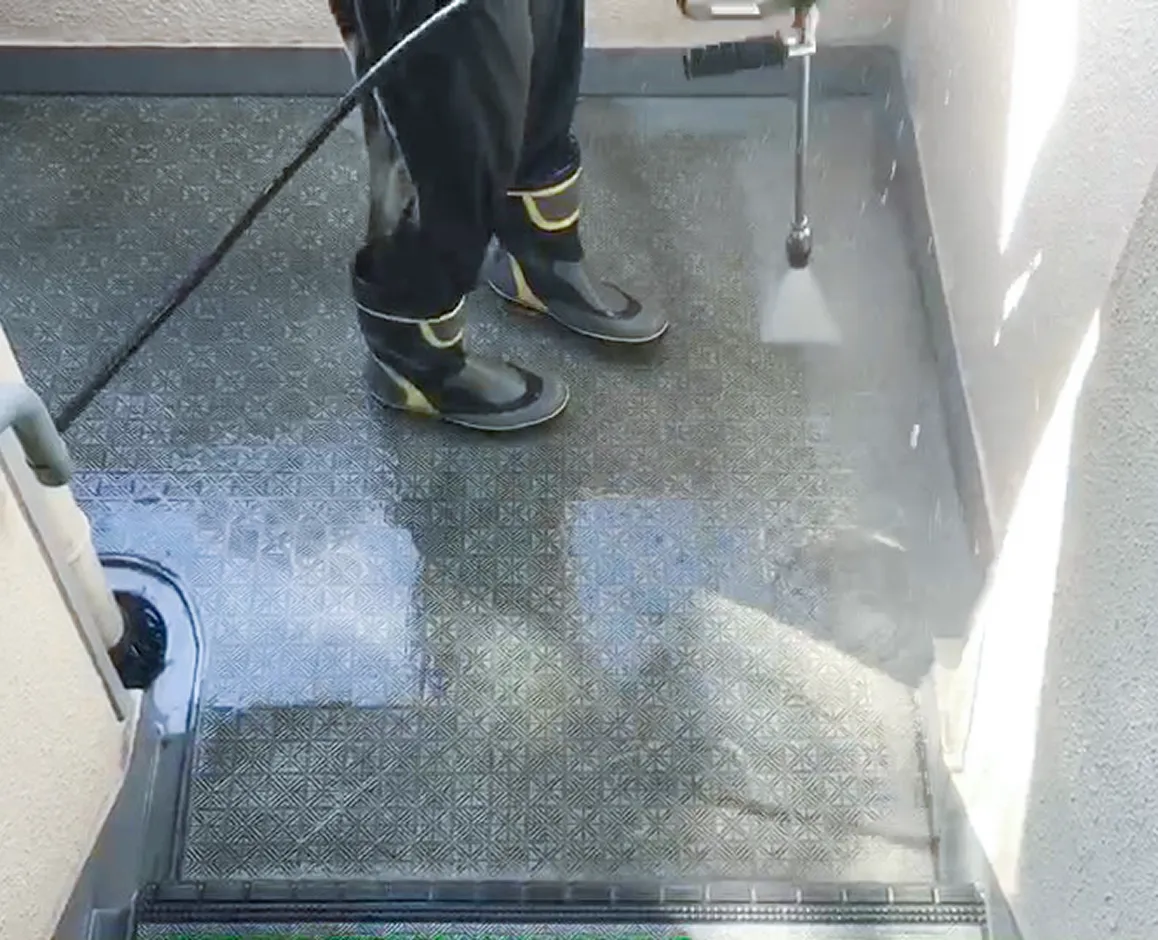 マンションやアパートの共用部床面は、コンクリート仕上げやエンボス仕上げが多く、汚れが染み込んだり凹部分に溜まったりするため、日常清掃の道具では取り切れないことがほとんどです。高圧洗浄機を使用することで、こうした汚れを一気に除去し、床面を綺麗な状態に戻すことができます。