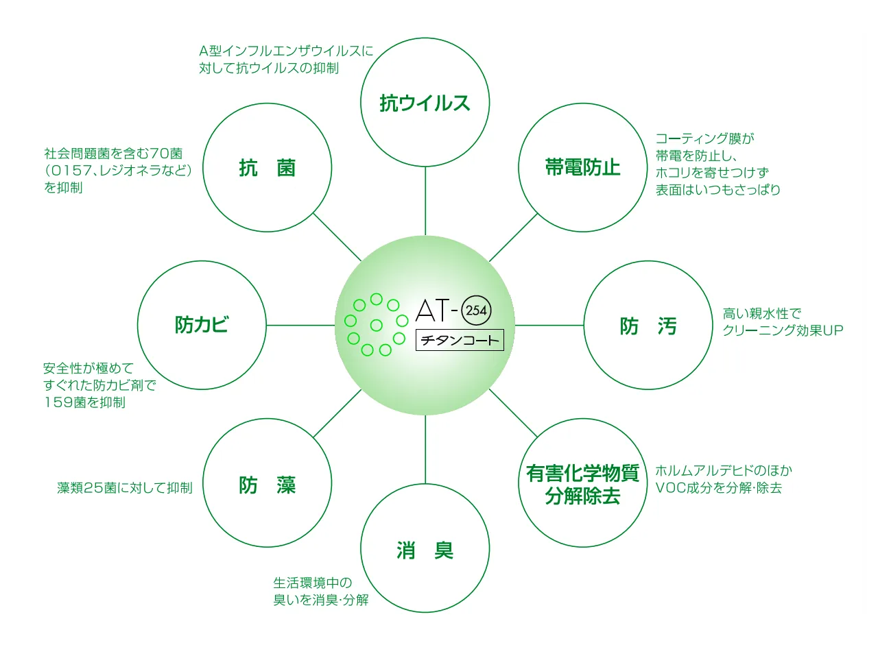 オールチタンAT254はその名前の由来にもつながりますが、抗菌効果(細菌70菌)・防カビ効果(真菌159菌)・防藻効果(藻類25菌)があり合計254菌に効果が実証されています。加えて抗ウイルス効果・消臭効果・防汚効果・帯電防止・有害化学物質分解除去があります。