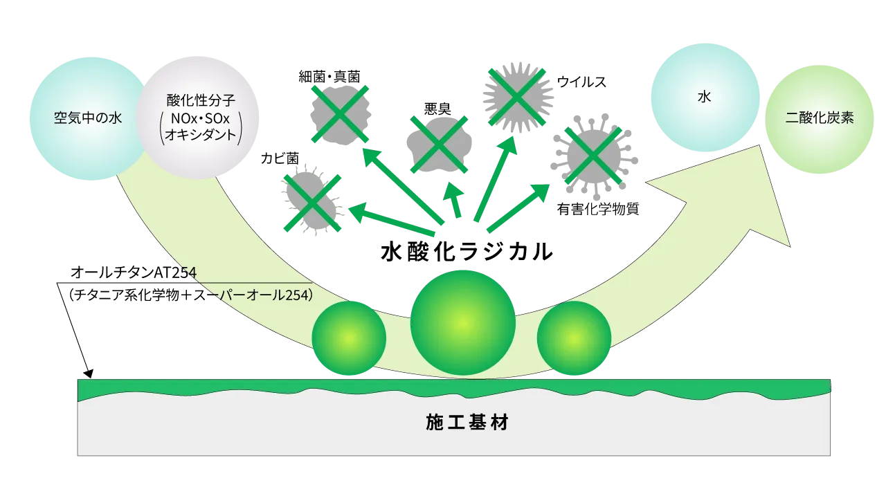 オールチタンAT254は、抗菌・抗ウイルス・消臭効果のある「チタニア系セラミックコート剤」と株式会社ブレス様が取り扱っている抗菌・防カビ剤である「スーパーオール254」をハイブリッドさせた新触媒です。