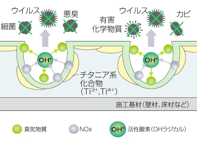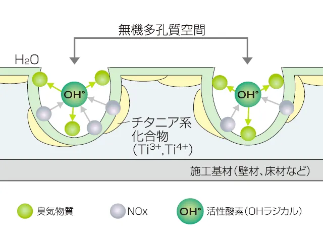 - 無機多孔質空間内において、チタニア系化合物が吸着水を通し、濃縮された酸化性汚染物質と反応して、活性酸素(OHラジカル)を発生します。